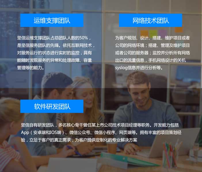 堅信核心團隊由三個子核心團隊組成,包換運維支撐團隊、網絡技術團隊、軟件研發團隊。