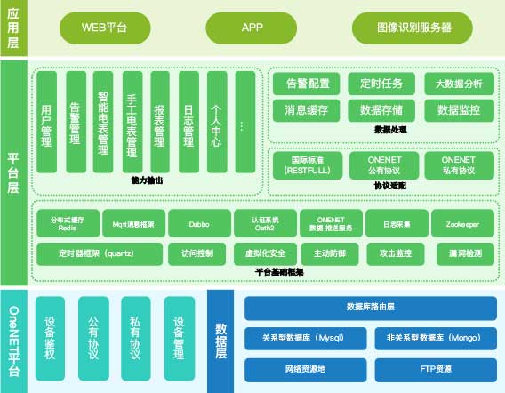 中國移動智能電表云集抄系統架構中,各類智能抄表終端內置2G/4G/NB-IoT通信模塊,由OneNet提供海量設備的管理和并發能力,通過無線網絡實現各類場景的智能抄表,通過電量管理平臺可實時監測電量變化,可管理、可追溯。