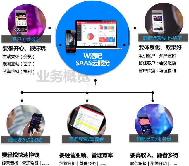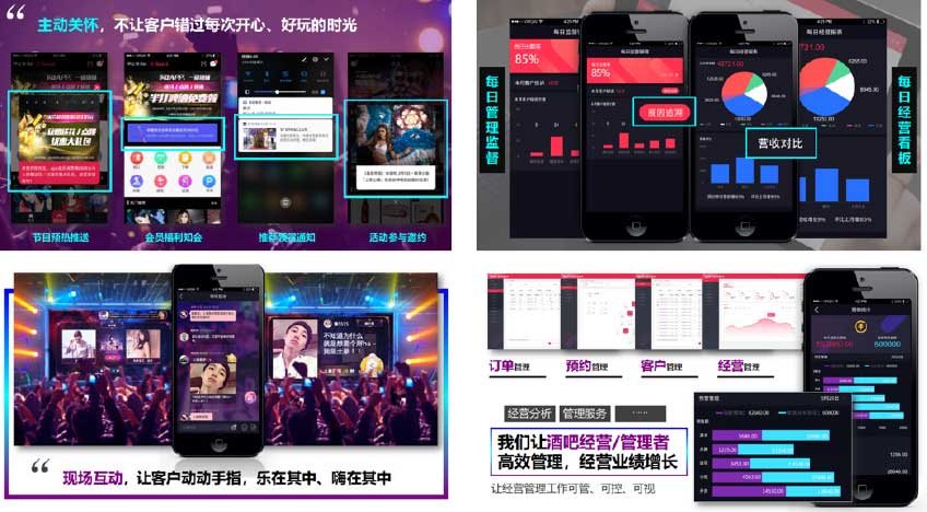 夢約智能酒吧平臺是借助最前沿的IT技術/互聯網技術/移動互聯網/物聯網技術等,融合酒吧業務,著力打造以“健康、休閑、愉悅、有趣、交友”為主題的 新型酒吧生態體系的平臺。平臺實現服務員線上管理/線上搶單、客戶APP下單/存酒/支付等智能管理手段,有效地節約酒吧業主的人力成本,提高管理效率。